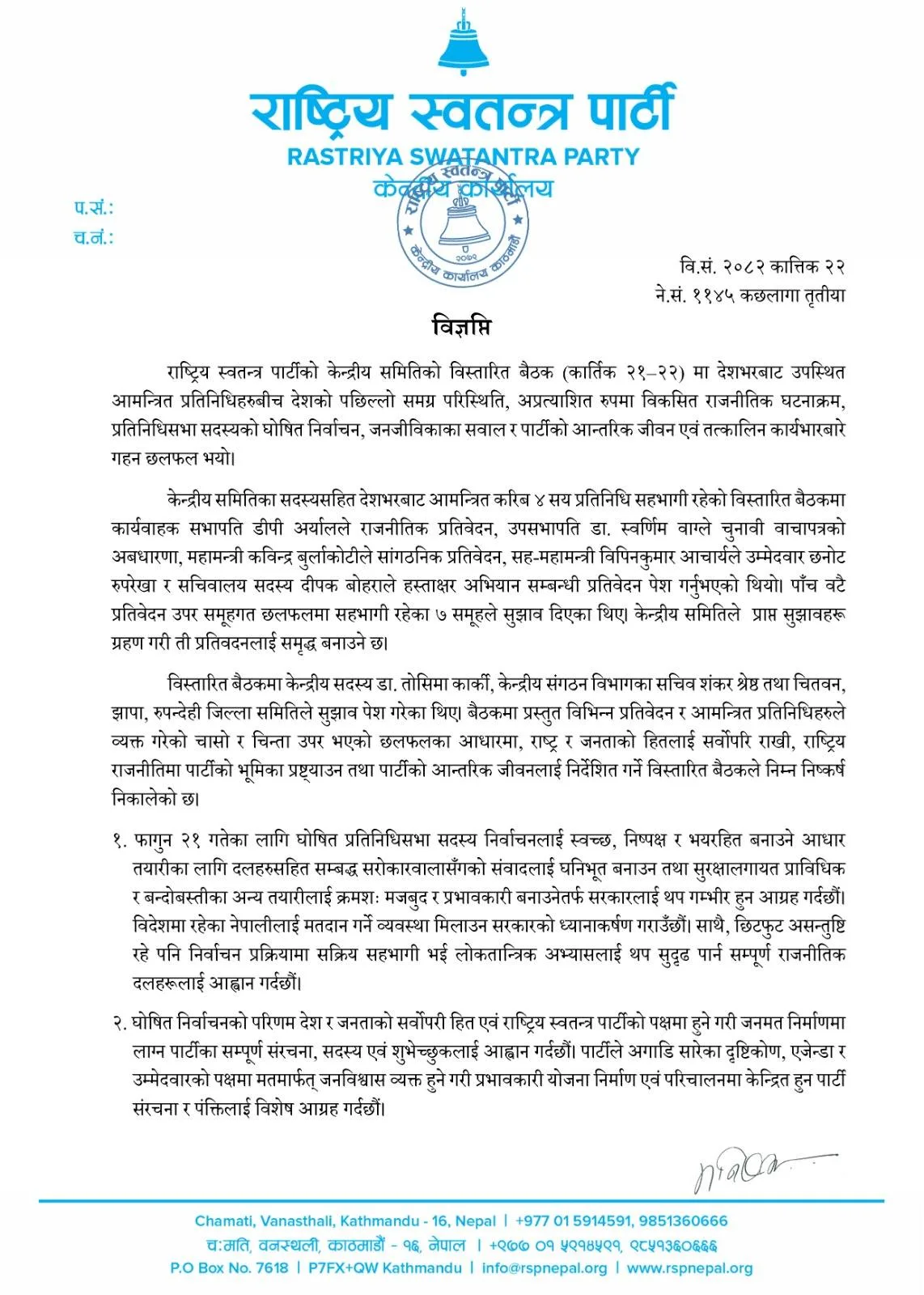 बैठकले फागुन २१ गते हुने निर्वाचनलाई स्वच्छ र निष्पक्ष बनाउन सरकारलाई आग्रह गर्दै विदेशमा रहेका नेपालीका लागि मतदानको व्यवस्था मिलाउन पनि ध्यानाकर्षण गराएको छ। रास्वपाले उम्मेदवार छनोटदेखि प्रचारसम्मका सबै प्रक्रियामा पारदर्शिता अपनाउने र युवाको सहभागिता अझ बढाउने निर्णय गरेको छ।